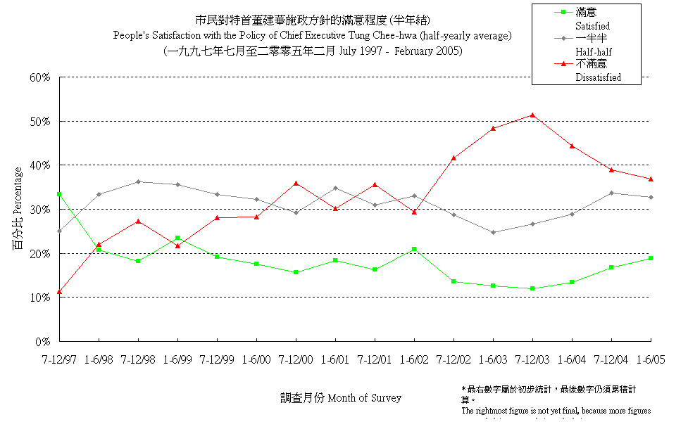 市民對特首董建華施政方針的滿意程度 (半年結) People's Satisfaction with the Policy of Chief Executive Tung Chee-hwa (half-yearly average) |